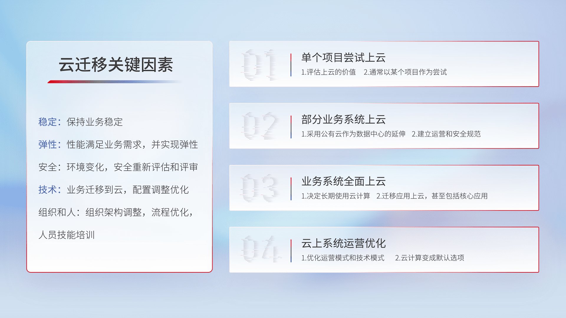 结合实际业务,,,,从规划设计、、、、云平台选型、、、云原生改造、、数据迁移、、、、集成交付,,,迁移全过程为客户识别最佳上云路径,,做好风险识别管理,,,设计网络架构、、、、身份权限、、、安全审计合规、、、操作审计、、、、日志审计、、、监控告警策略、、多站点容灾设计等,,,,对云上基础设施进行整体规划,,,提升IT治理水平,,,,以满足弹性、、、、高可用、、高性能的需求。。。。